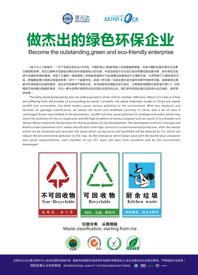 并在企業(yè)內(nèi)部進(jìn)行垃圾分類培訓(xùn)和宣傳,我們將垃圾進(jìn)行分類處理以減少對(duì)環(huán)境的污染!