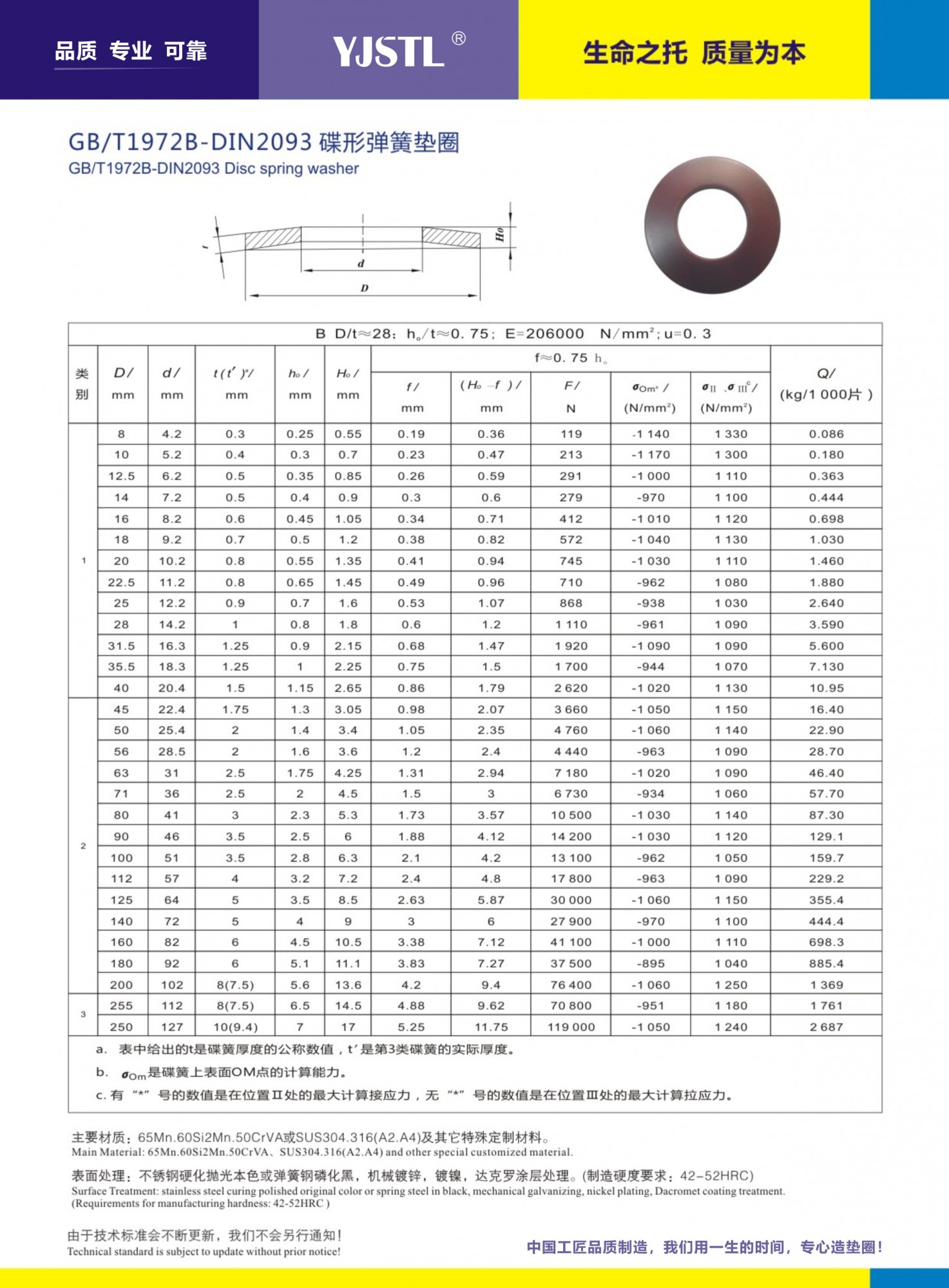 制造執(zhí)行標(biāo)準(zhǔn):國標(biāo)GB1972ABC引用DIN2093(ABC系)。規(guī)格:M-M127 也能根據(jù)客戶需求提供訂制,主要材質(zhì)有65MN,60Si2mn,51crav4及特殊合金材質(zhì),鹽浴硬化,表面處理為磷化黑,機(jī)械鋅,達(dá)克羅涂層等!不提供化學(xué)電鍍處理!多數(shù)情況下標(biāo)準(zhǔn)型碟形彈簧墊圈并不能完全滿足用戶要求,通過計(jì)算與適當(dāng)調(diào)整來獲得理想的訂制功能!