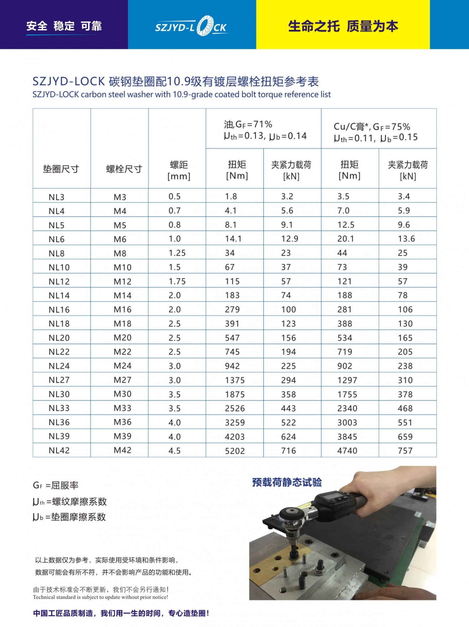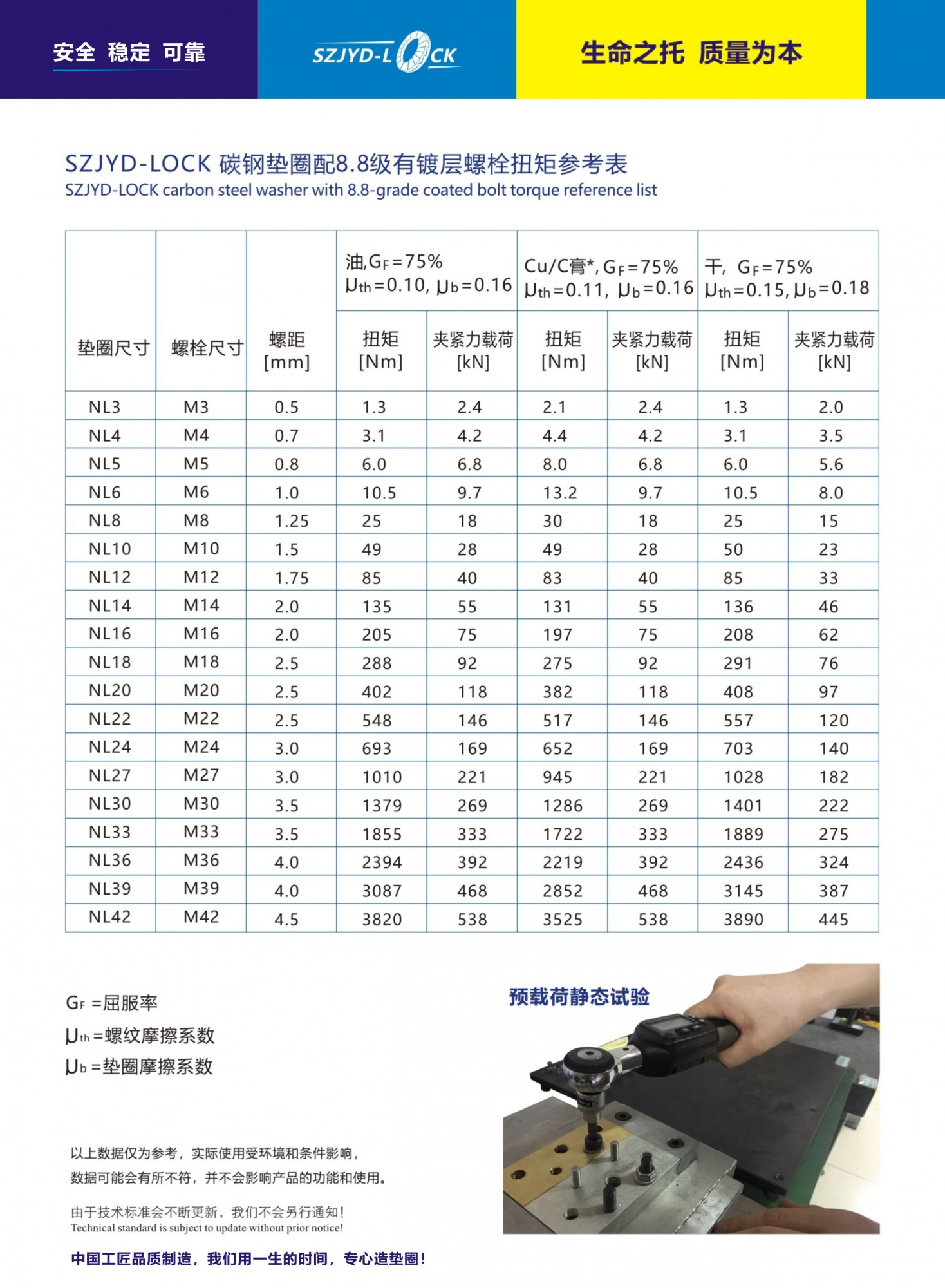 雙疊自鎖墊圈的使用:墊圈兩個(gè)大斜齒面成對(duì)粘合,目的是便於安裝和防止錯(cuò)誤使用!墊圈的硬度必須高于螺栓的硬度!SZJYD-LOCK墊圈全部經(jīng)過DIN65151橫向振動(dòng)測(cè)試可以達(dá)到200萬測(cè)試、其衰減率不低于70%!