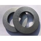 獨(dú)特的墊圈的內(nèi)側(cè)斜齒面傾斜角度 α 大于螺栓螺紋傾斜角度 β 。 裝配時(shí), 內(nèi)側(cè)斜齒面是相對(duì)的, 墊圈外側(cè)放射狀的凸紋面 (外滾花齒面) 的摩擦系數(shù)要比內(nèi)側(cè)斜齒面 的摩擦系數(shù)大, 且與兩端接觸面成咬合狀態(tài)。 當(dāng)連接件受到振動(dòng), 并使螺栓發(fā)生松動(dòng)趨勢(shì)時(shí), 僅僅允許兩片墊圈內(nèi)側(cè)斜齒間相對(duì)抬升錯(cuò)動(dòng), 產(chǎn)生擡升張力。 獨(dú)特的齒牙系統(tǒng)利用張力在緊固的 連接處產(chǎn)生壹個(gè)很高的抵抗力來經(jīng)受振動(dòng)力,從而達(dá)到 100% 的防松效果。