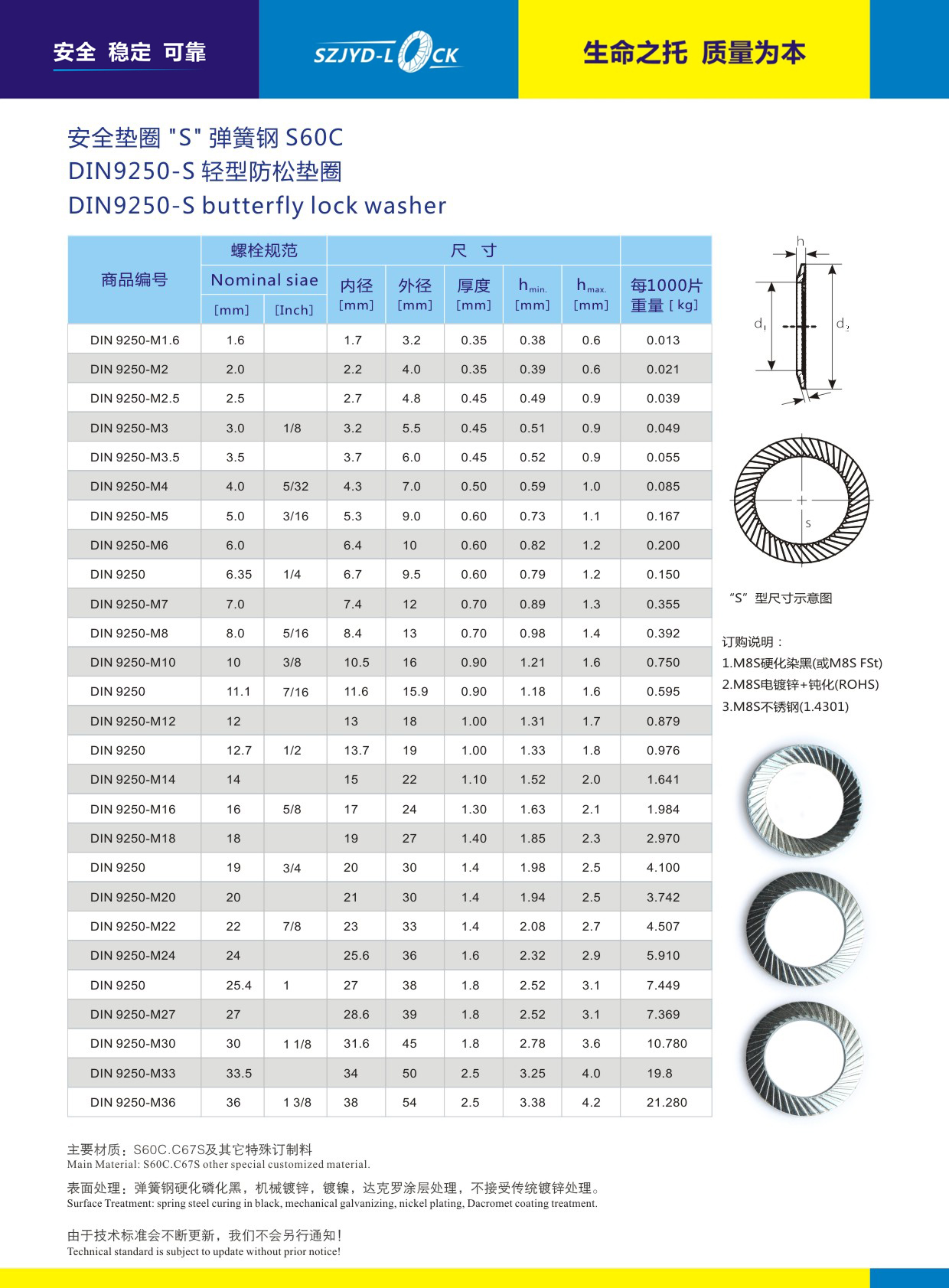 DIN9250防松墊圈、執(zhí)行德國標準、按螺栓的使用條件分為兩類:8.8級以下螺栓均選用S輕型安全防松墊圈、10.9級以上螺栓均先用VS重型安全墊圈系列、
