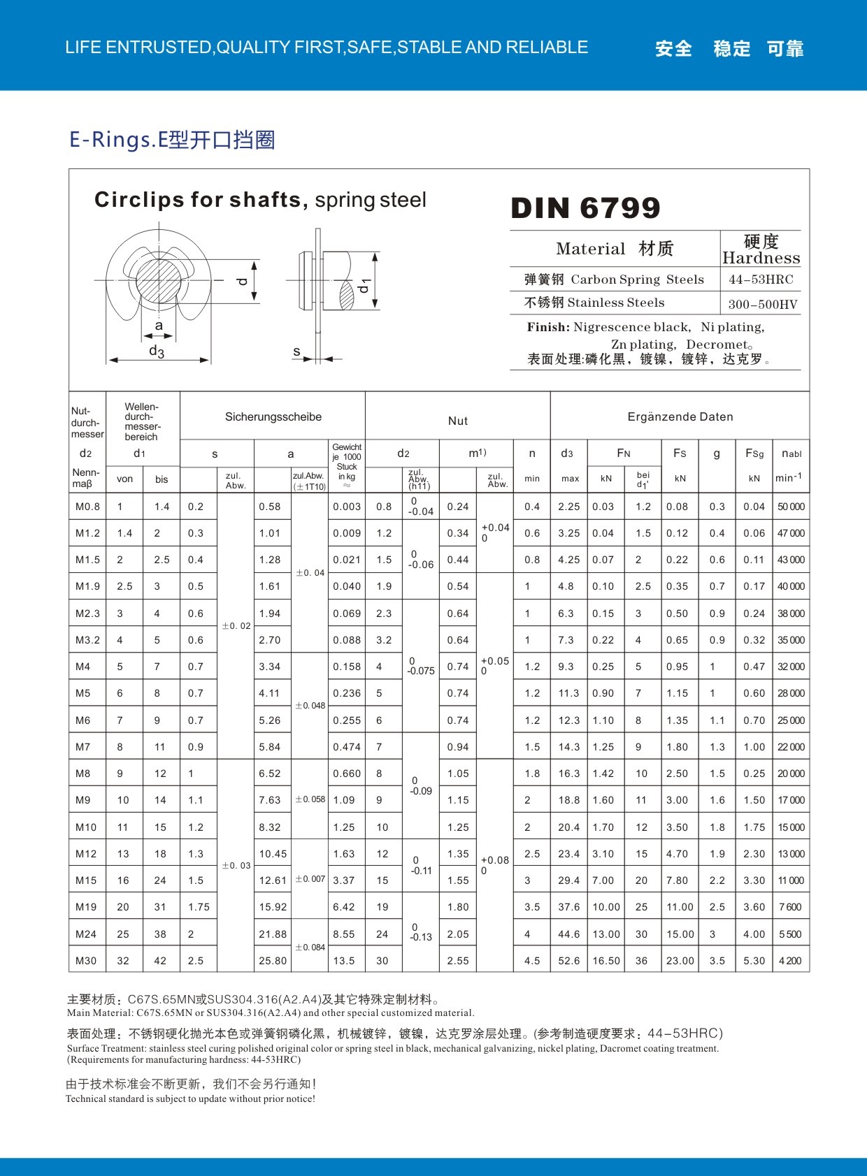 德國標準DIN6799開口擋圈,使用65MN,C67S彈簧鋼材質及SUS304.SUS316/EN1.4301.EN1.4401不銹鋼材質,硬化質量穩(wěn)定,回彈性好!彈簧鋼表面磷化黑,機械鋅等!鹽霧可達500H以上,保證無氫脆斷裂!瑞士模具制造設備,可生產(chǎn)0.8微精密開口擋圈,史特牢公司級進模具生產(chǎn)高效率低成本!