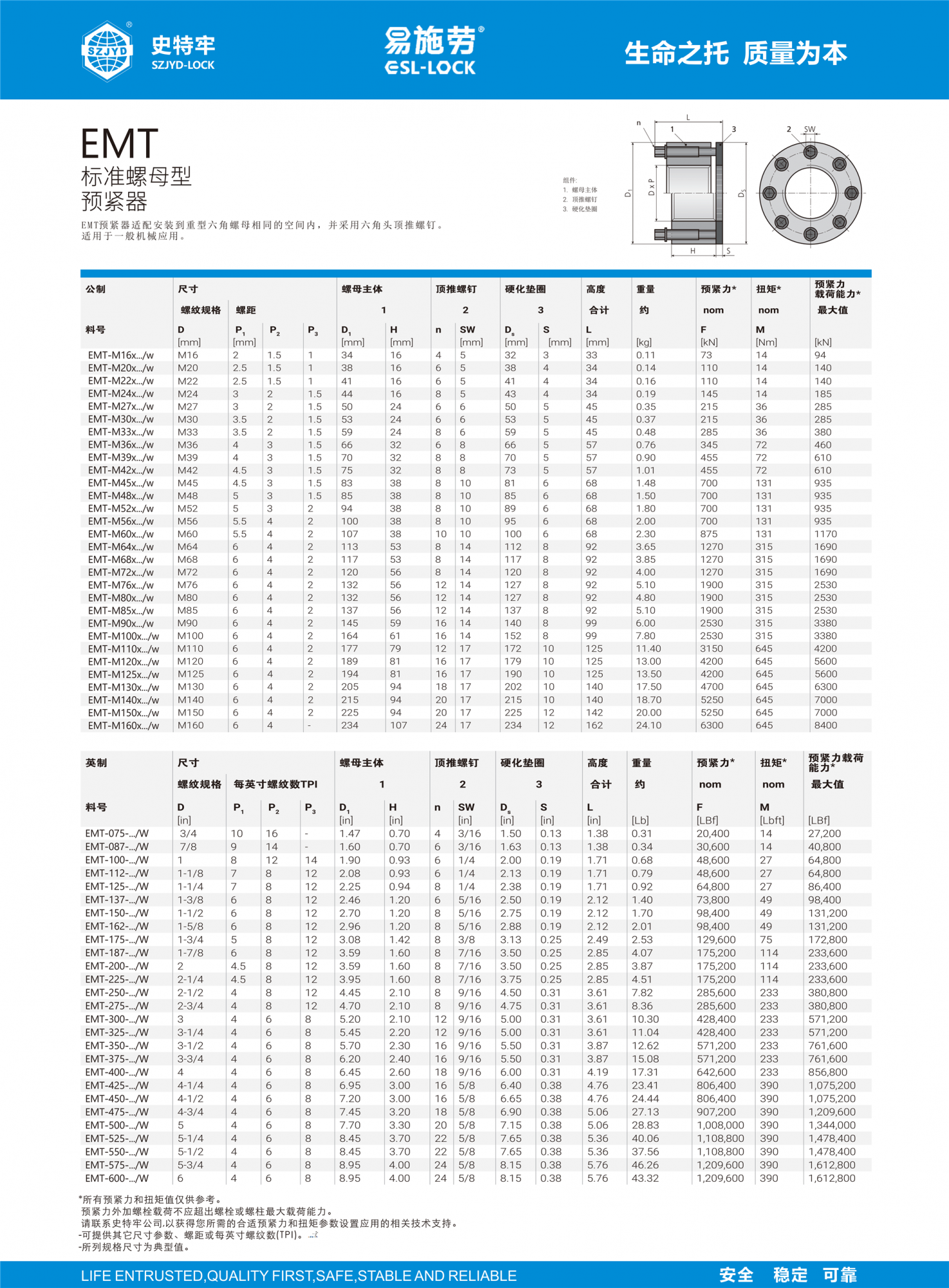 多頂推超級(jí)預(yù)緊器,可在很小空間安裝,使用簡(jiǎn)單工具即可輕松預(yù)緊,節(jié)省安裝時(shí)間,ESL-LOCK品牌易施勞超級(jí)螺母具有完全的防松鎖緊功能,可多次拆卸重復(fù)使用。特別適用于M24規(guī)格以上大型螺栓鎖緊!一擰永固,永不松動(dòng)!使用常規(guī)格為合金材料及特殊不銹鋼合金材料以及鎳基合金材料!更多了解歡迎咨詢我們.....